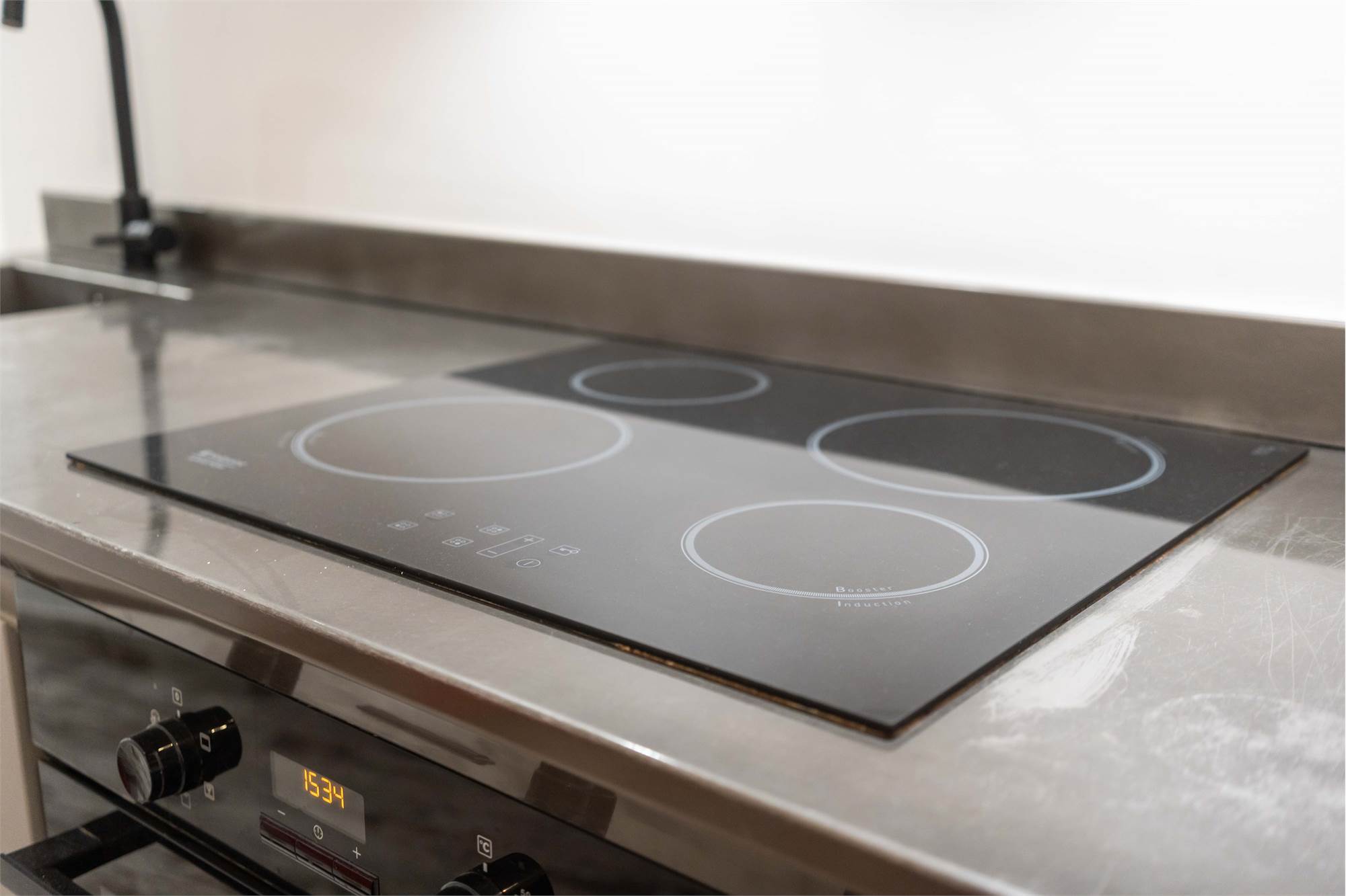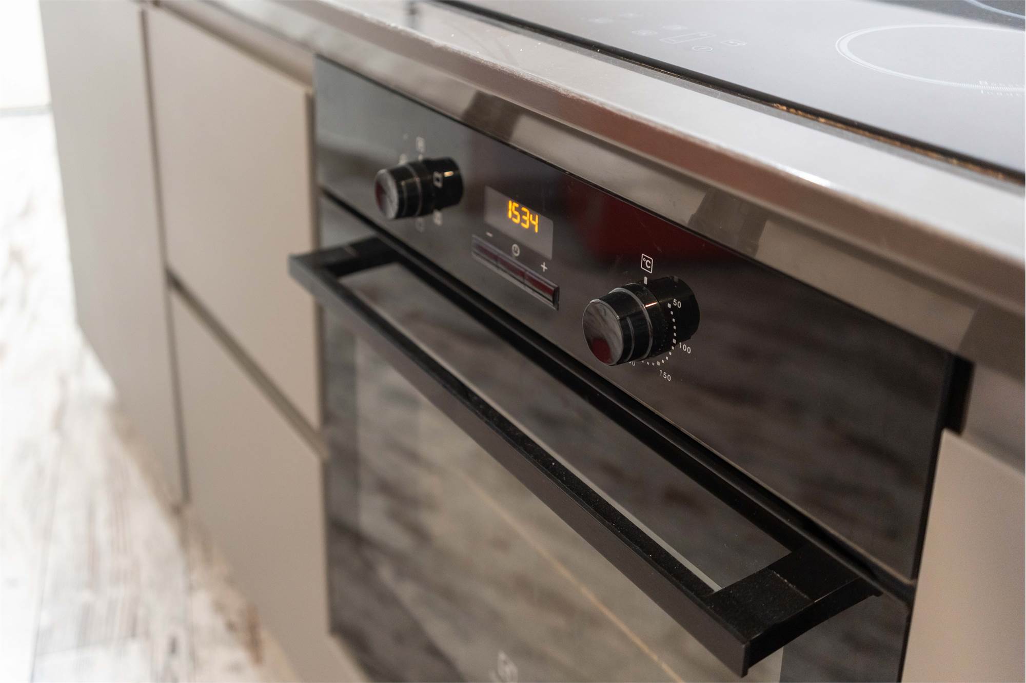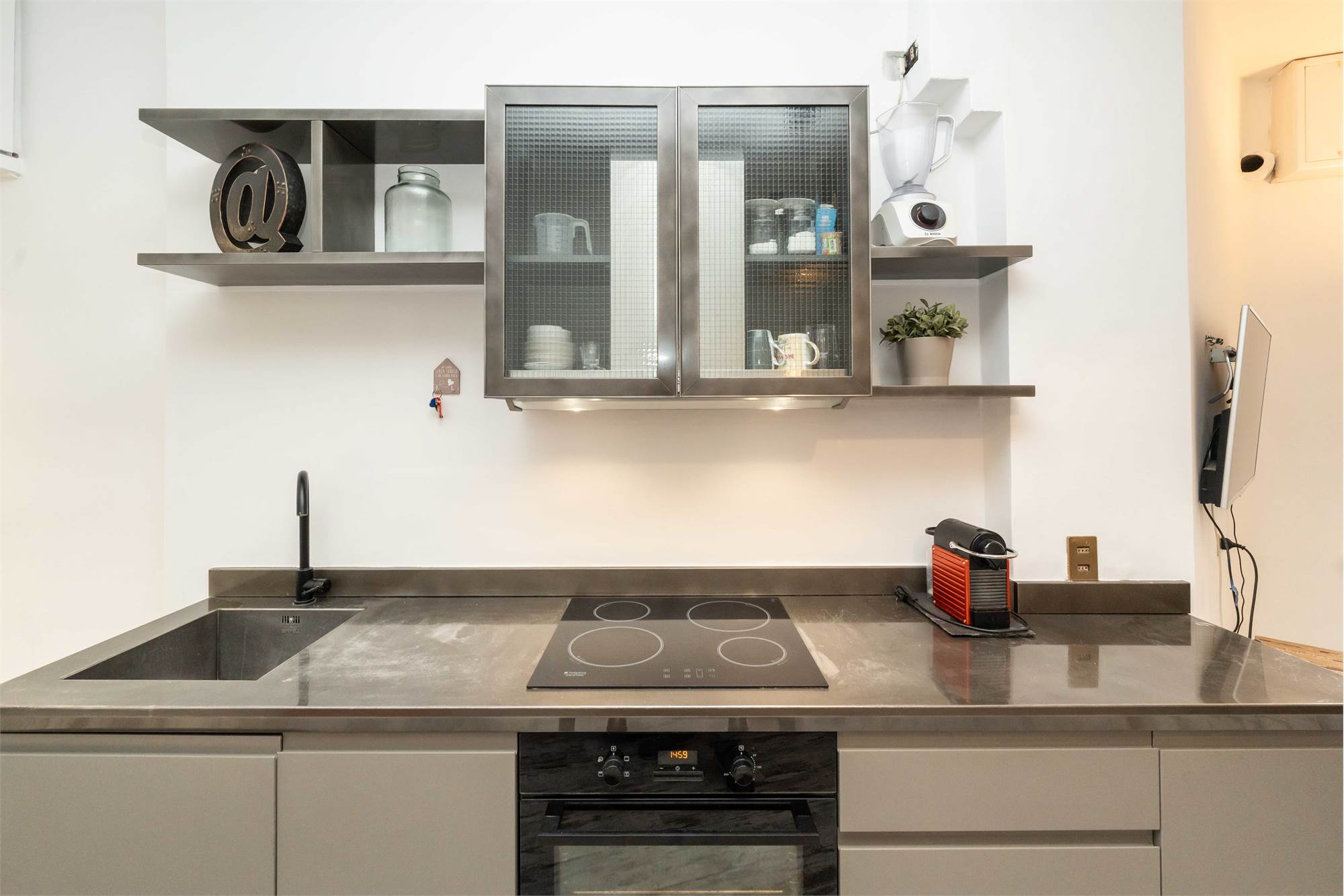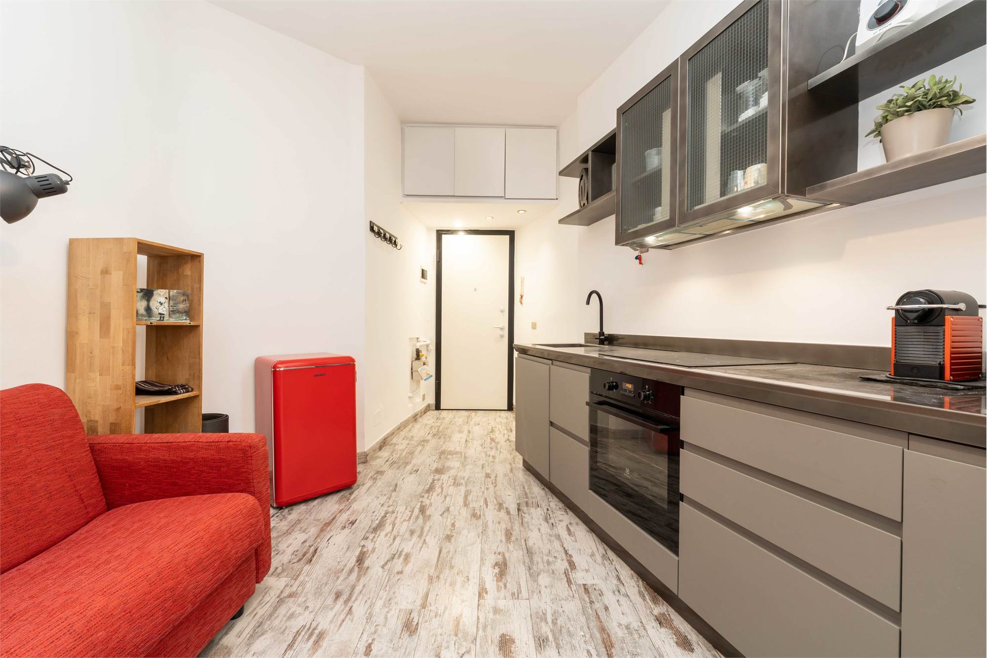 L’appartamento si apre su un soggiorno con cucina a vista, uno spazio pratico e ben organizzato, ideale per la vita quotidiana.