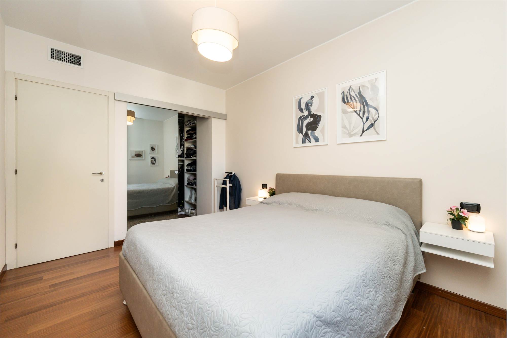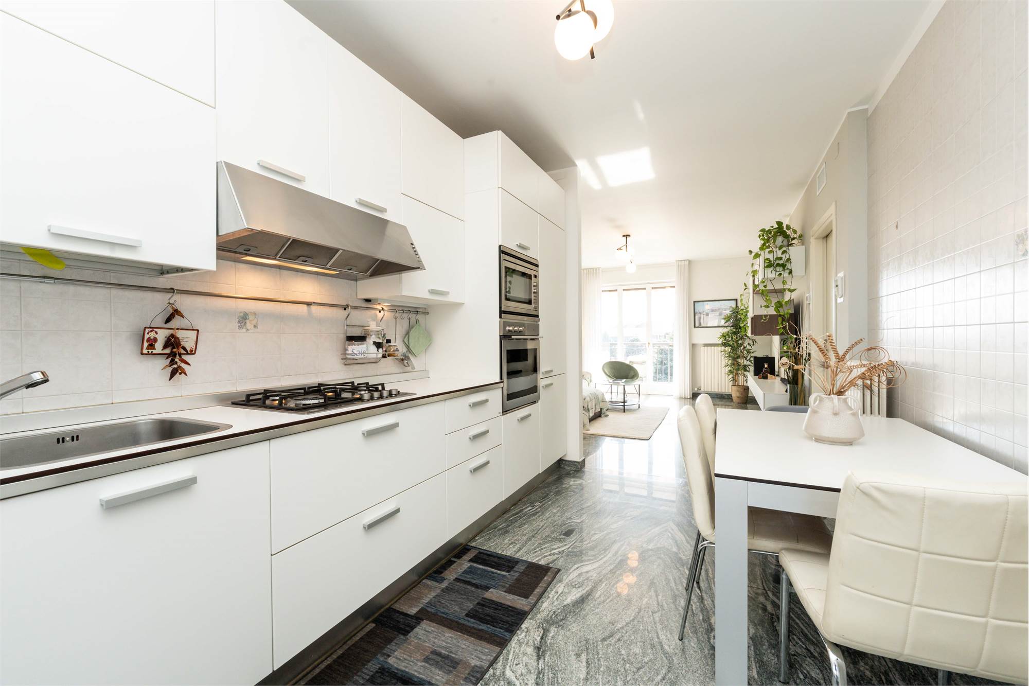 La casa si apre su un ampio soggiorno che dialoga con una cucina abitabile separata. La zona notte comprende due camere da letto: la matrimoniale è arricchita da una cabina armadio walk-in di concezione moderna. Presenti inoltre due bagni finemente rinnovati.
